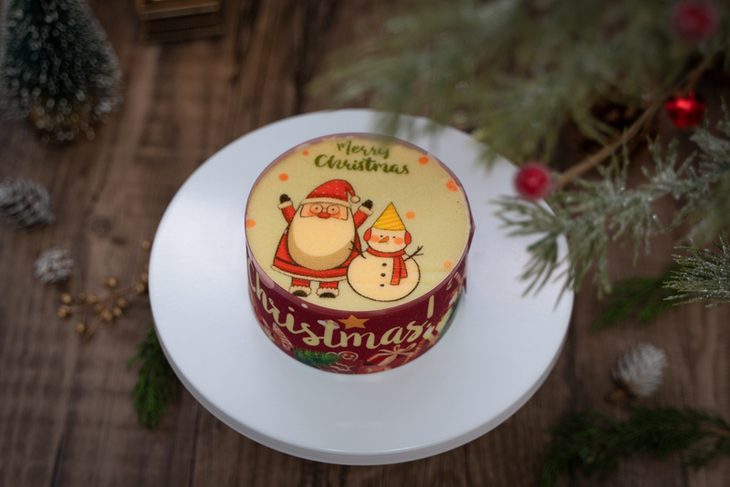 Sponge Cake Base: A light, airy sponge cake forms the foundation, with a delicate printed top featuring Santa and a snowman, creating a whimsical, festive appearance.