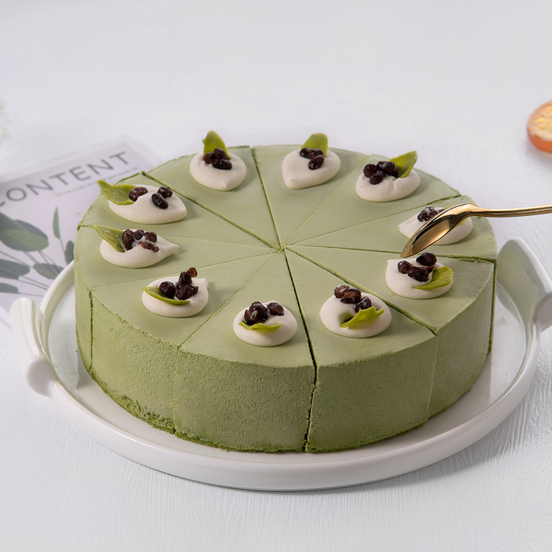 视觉上令人惊叹: 抹茶海绵蛋糕和抹茶慕斯的交替层创造出令人惊叹的视觉对比,使其成为任何甜点桌的核心装饰品。