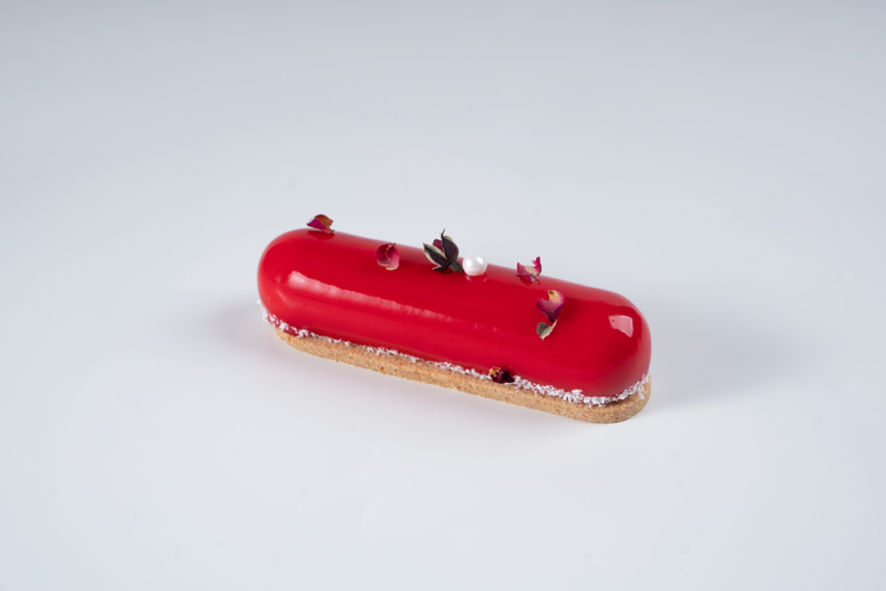慕斯蛋糕上塗有紅色釉料,極具視覺衝擊力。裡面是草莓慕斯、覆盆子餡料和榛子蛋糕。底部放上黃油餅乾,後續在底部撒上一些椰子。豐富的材質給人以味覺上的充分滿足。