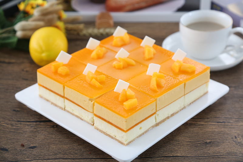 蛋糕進一步增強了一層原味烘焙的芝士蛋糕,為甜點增添了奶油和放縱的元素。芝士蛋糕層光滑柔軟,帶有微妙的濃郁味道,平衡了芒果凝膠的甜味。其豐富的奶油質地為整體成分增添了深度。