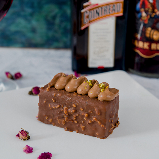 為了完成這個令人放縱的傑作,整個蛋糕都包裹在一層堅果巧克力中。堅果的嘎吱聲與慕斯和蛋糕層的光滑度形成令人愉悅的對比,創造出一種質感的交響樂,讓您渴望更多。